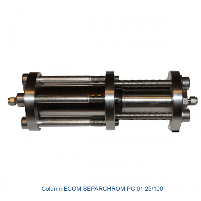 Separchrom PC01 ECOM columns correspond to the highest requirements of preparative liquid chromatography. They are designed to be used in a mode of axial compression with a moving input piston. In the original design, they are equipped with identical pistons on input and output (biaxial compression as an option). In the ECOM Separchrom PC FE modification, they have a fixed end plate on the output instead of the piston. Pistons and plates are equipped with frits. A liquid distributing system is installed under each frit. The design guarantees perfect piston flow, high efficiency even for high injection volume, and simple accessibility of frits for cleaning. Columns can be packed by dynamic slurry method, sedimentation, or sorbent in a dry state.