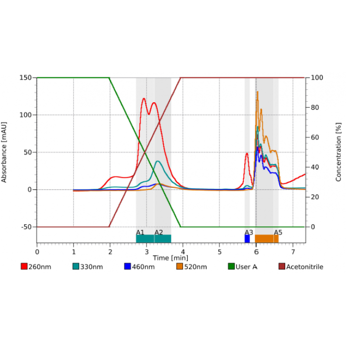 It is a UV-VIS diode array detector, which allows measuring absorbance at four wavelengths in the range of 200‑800 nm simultaneously, just as scanning of the whole spectrum. Standardly, there is an assembled PFC cell with an optical path length of 0.3 mm, but other cells are available.