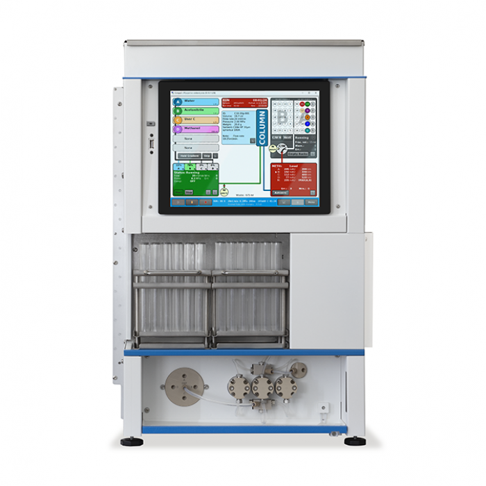 Controlling: System PC information: An industrial PC with a 4-core processor is installed. It runs on the Linux operating system and has a 12.1“ touchscreen with a resolution of 1024 × 786. The QUEEN software controls the gradient, flow rate, wavelengths, fraction collection, etc. The user gains full control with detailed results and the option of remote administration.