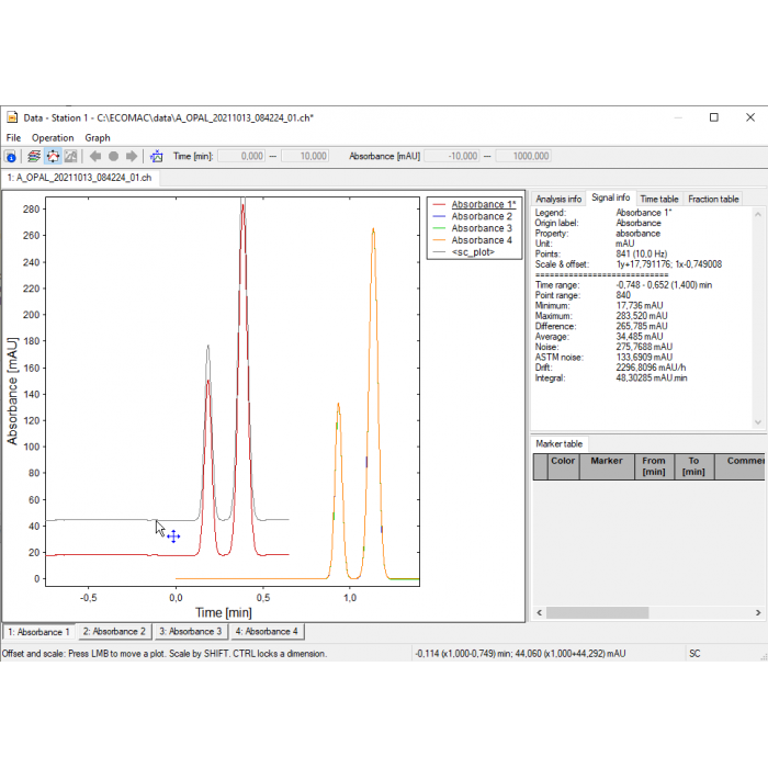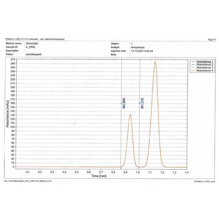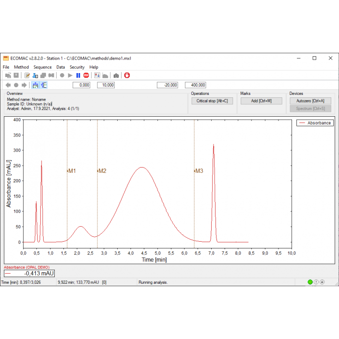 On the screen, we can watch the parameters of all units for example detector absorbance, pump pressure, and column oven temperature. It allows monitoring of the whole system by stabilization or by problem searching. It is possible to record, print, and export all data.