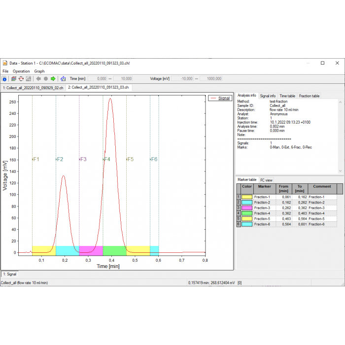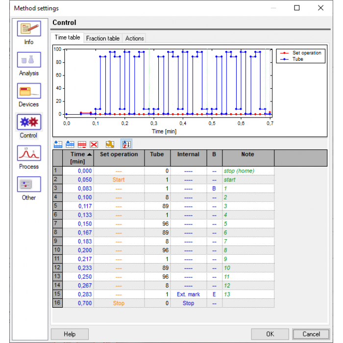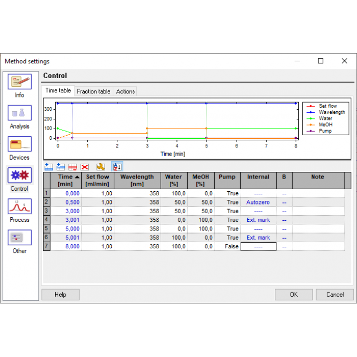 • Simple method creation (possibility to fill in method, analysis and sample information, control through Time Table (gradient table setting and a lot controlling function for the device) and Fraction Table (sample collecting)