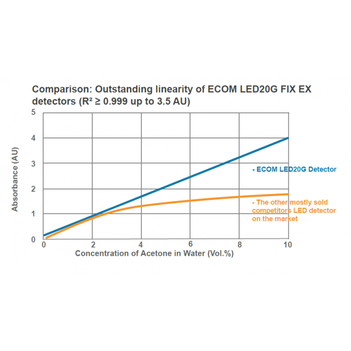 The LED20G EX Detectors with UV-VIS Light Emitting Diodes (LED) as a light source are built-in UV-VIS detectors for preparative and flash chromatography for use with an external cell. It has excellent linearity up to 4AU and a narrow spectral half-width.