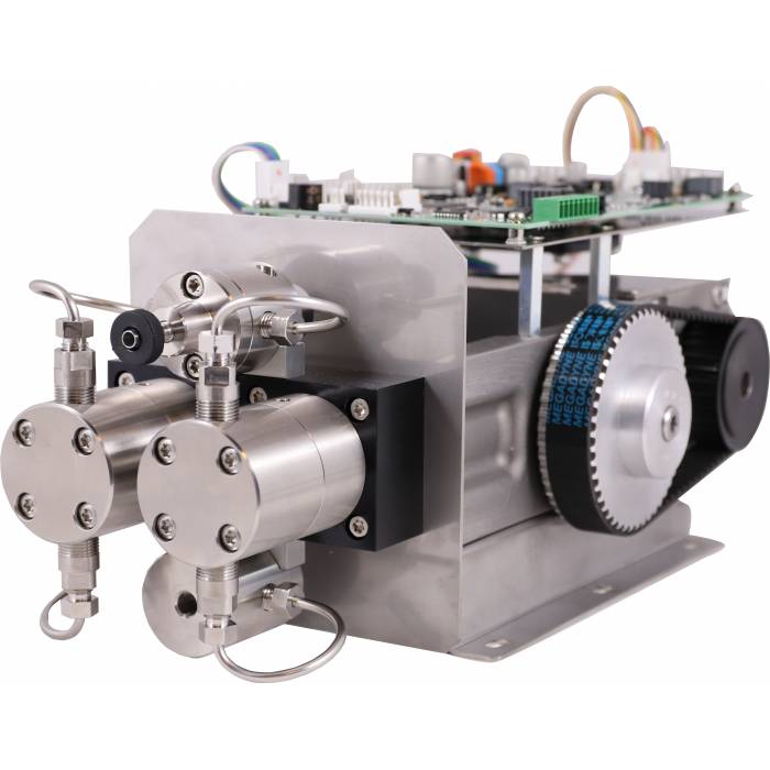 The pump has two pistons connected in parallel, with a diameter of 3/8”. It is suited for preparative liquid chromatography, where high pressure is needed, etc. The advantage of this pump is a very stable run even at low flow rates. Also available in configurations made of certified bio-inert materials.