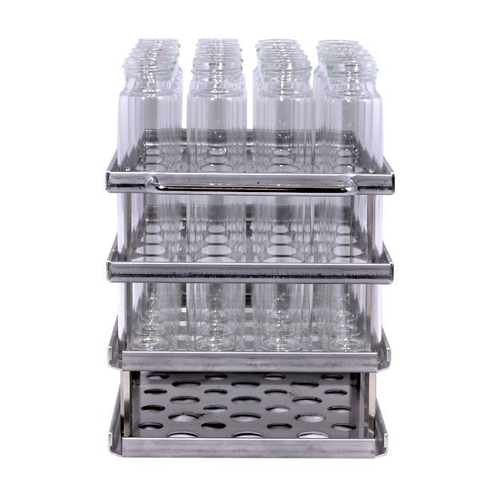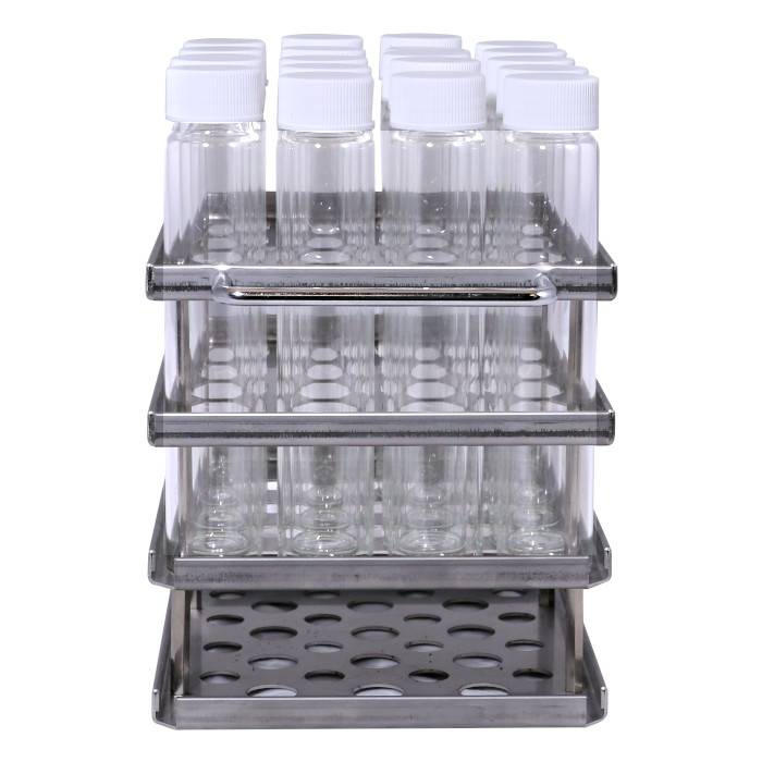 Rack for 20 pcs of closable fused silica vials with a PP (EPA class, ND24) cap, volume of each vial is 60 ml.